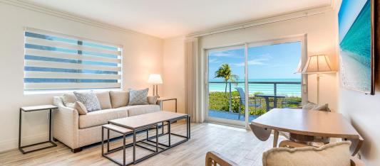 Enjoy beautiful views of the Gulf of Mexico and our famous Sanibel sunsets in a comfortable 500 square feet of living space with luxurious, contemporary design elements and lots of amenities. Our suites feature a King bed in a separate bedroom and a pull out sofa in the living area facing the ocean. Gulf View rooms take in the surrounding landscape as well as views of the Gulf of Mexico.